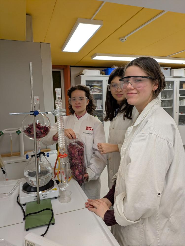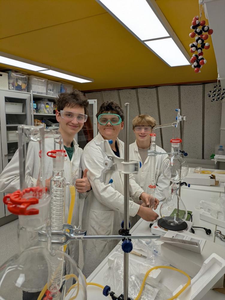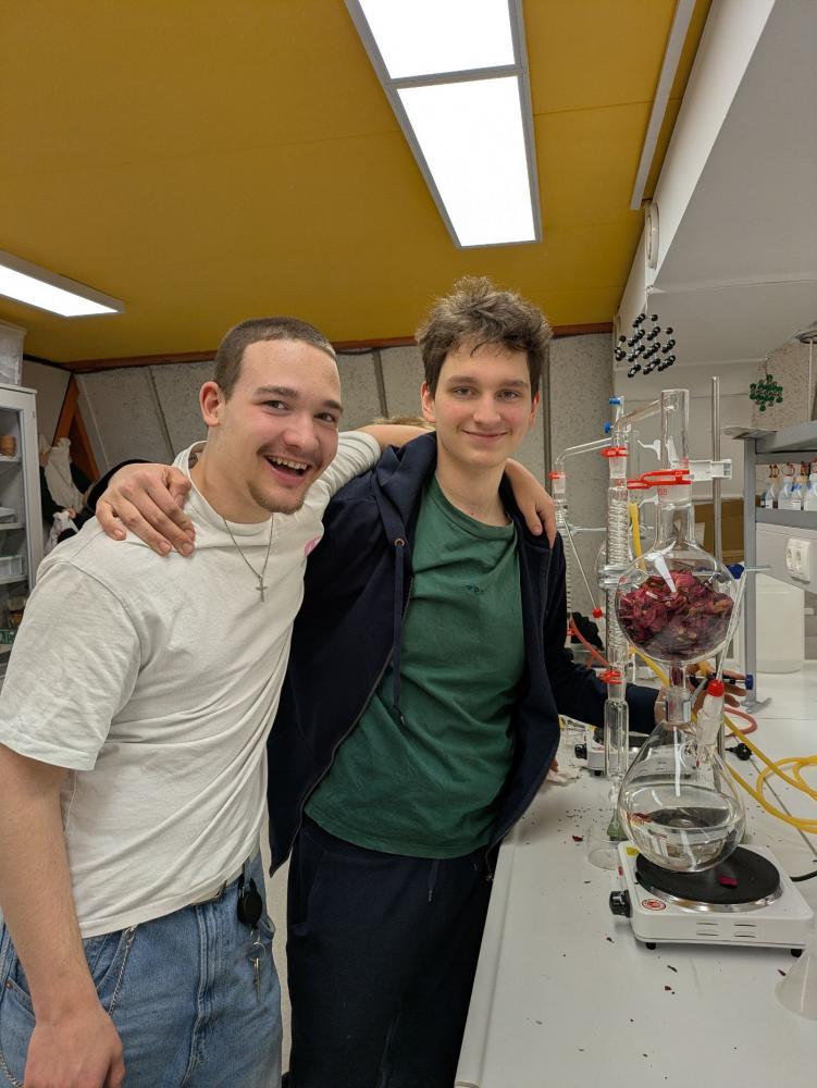 Dieses Semester haben wir im Modul Chemielabor viel experimentiert. Unter anderem beschäftigten wir uns mit der Titration zur Messung der Wasserhärte, dem Tüpfeln als Methode der qualitativen Analyse, der Cyanotypie sowie der Wasserdampfdestillation zur Gewinnung von ätherischen Ölen aus Lavendel, Orangenschalen oder Rosenblättern. Es war beeindruckend zu sehen, wie viel Arbeit hinter einem kleinen abgefüllten Fläschchen ätherischen Öls steckt.