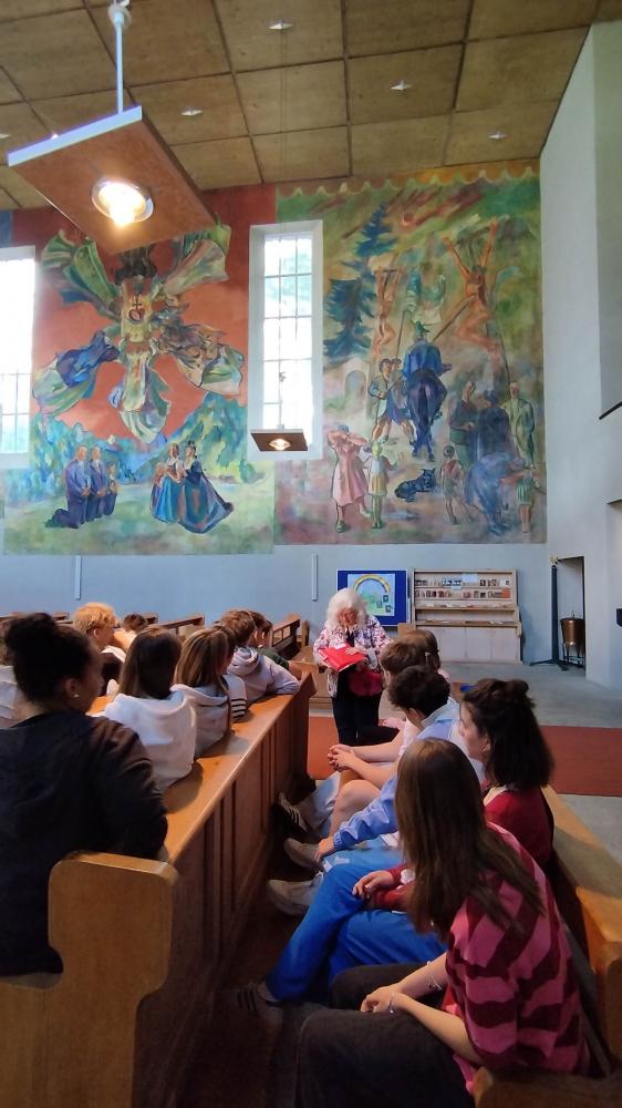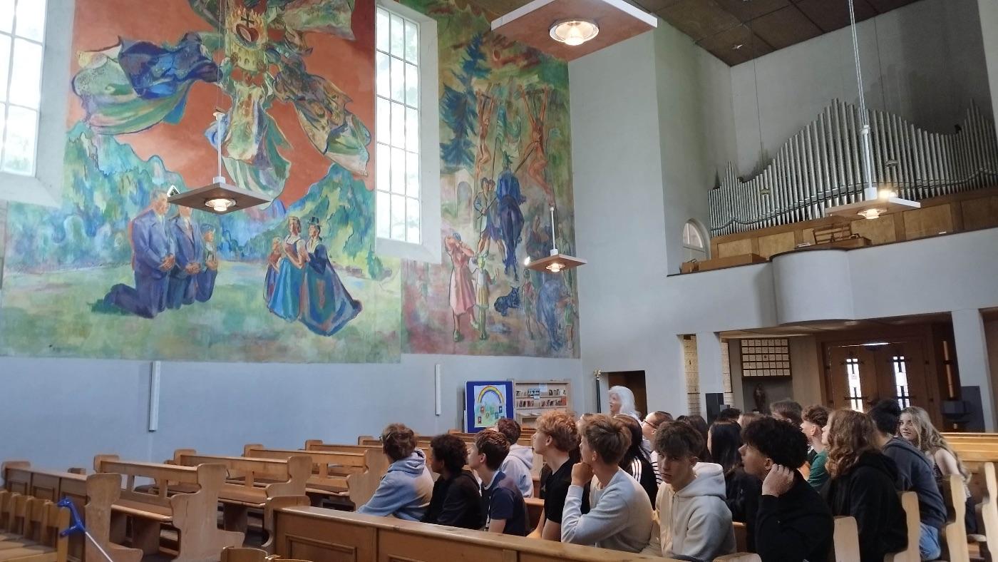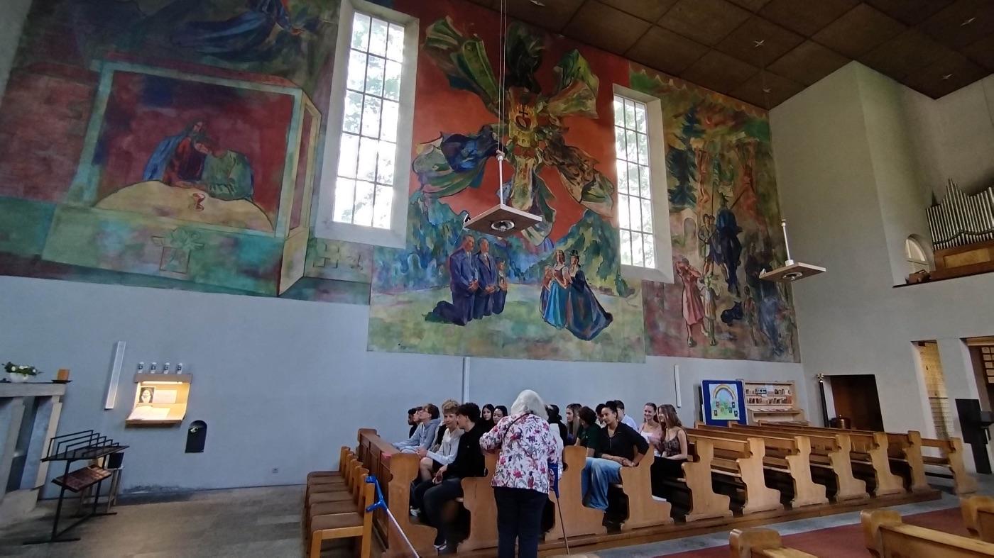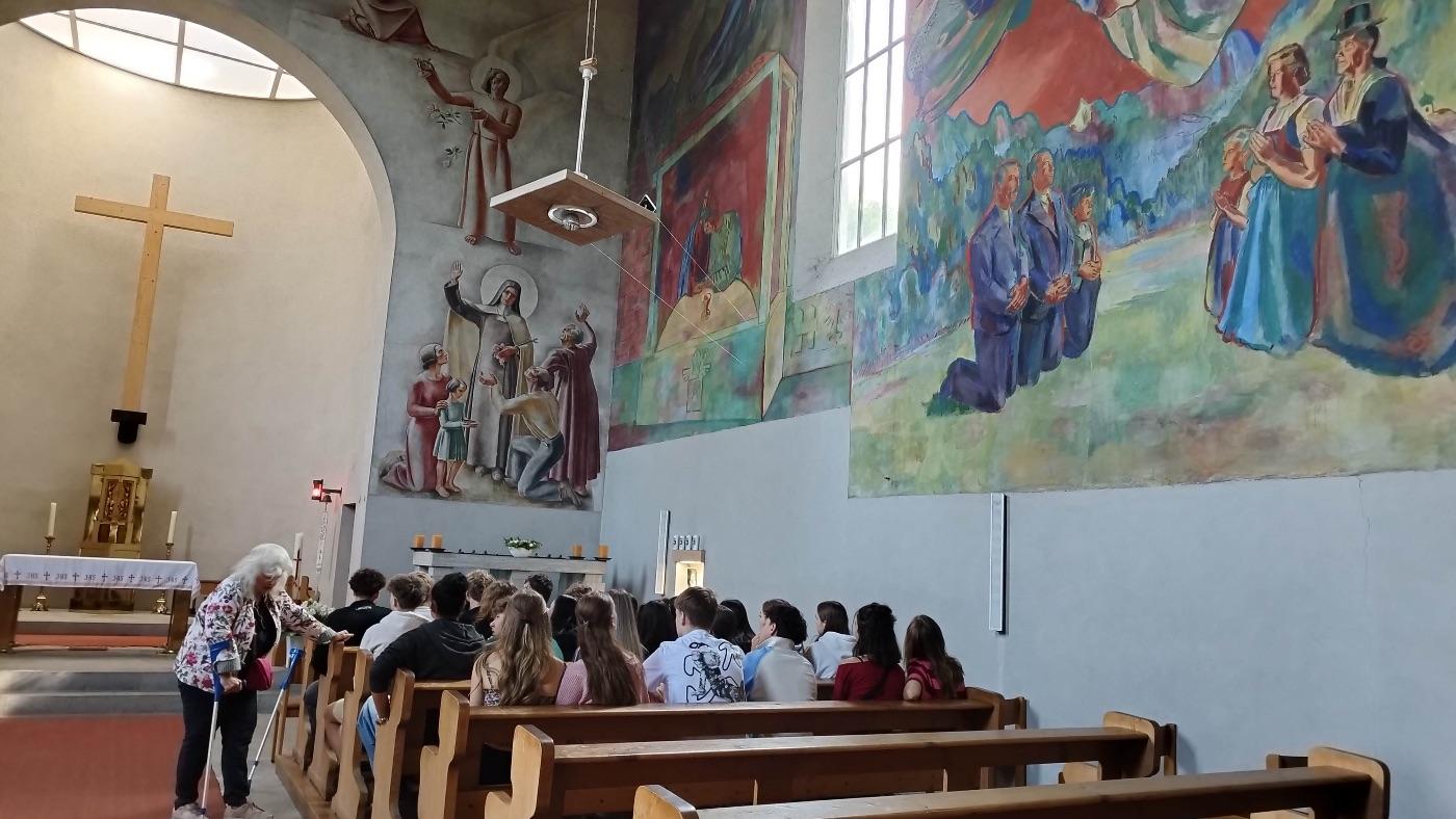 Am 6. Juni 2025 war die 5b zusammen mit Frau Prof. Petz in der Theresien-Kirche auf der Hungerburg in Innsbruck, um die Fresken von Max Weiler zu besichtigen. Nach unserer Ankunft erhielten wir eine interessante Führung von Frau Frenzel, bei der wir viel über die damalige Zeit und die Fresken erfuhren. Die Fresken zeichnen sich durch ihre lebendige Farbgestaltung, die feine Detailarbeit und die tiefgründige religiöse Symbolik aus.